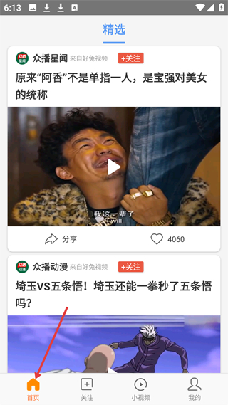 1、首頁,展示娛樂星聞、動漫類精選視頻,可關注創作者,支持分享點贊,是視頻瀏覽推薦入口。