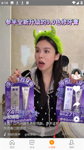 2、小視頻頁,呈現參半牙膏推廣視頻,有點贊、分享、看相關功能,是小視頻觀看區域。