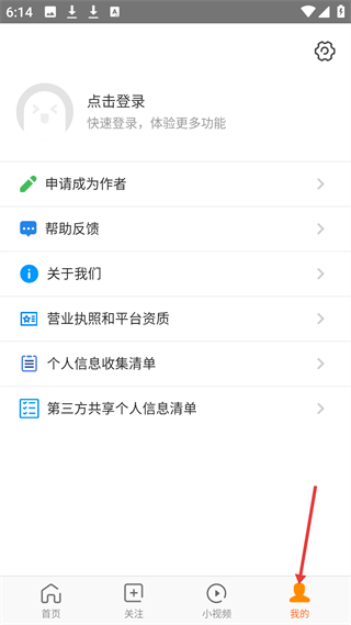 3、我的頁面有登錄入口,可申請成為作者、查看幫助反饋、了解平臺信息等,是個人中心及功能服務聚合頁。