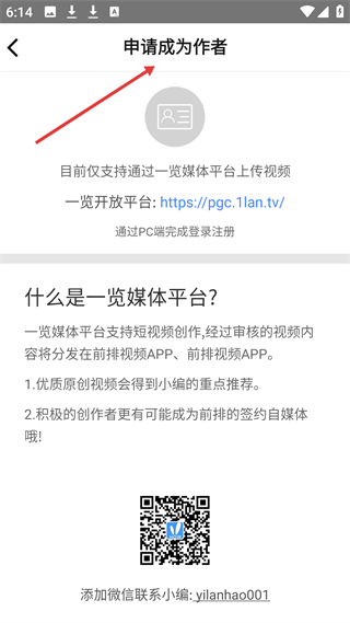 4、申請作者頁,需通過一覽平臺傳視頻,介紹平臺功能優勢,提供注冊鏈接和小編聯系方式,是創作者入駐指引頁。