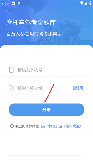 1、進入登錄界面,輸入手機號與驗證碼,勾選用戶協議及隱私政策后,點擊登錄按鈕,進入駕考題庫的使用系統。