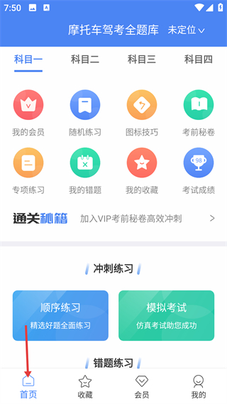 2、登錄后進入首頁,可切換不同考試科目,選擇順序練習或模擬考試等功能,開啟摩托車駕考的題目練習環節。