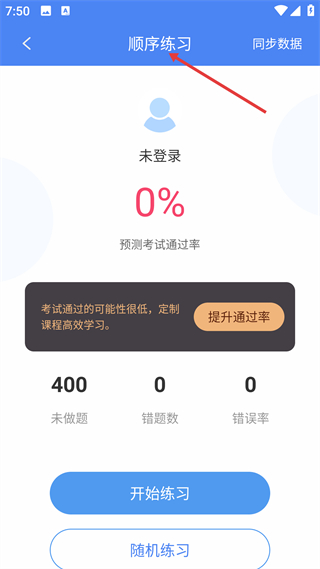 3、進入順序練習界面,查看未做題數等數據,點擊開始練習或隨機練習按鈕,進行駕考題目的按序練習操作。