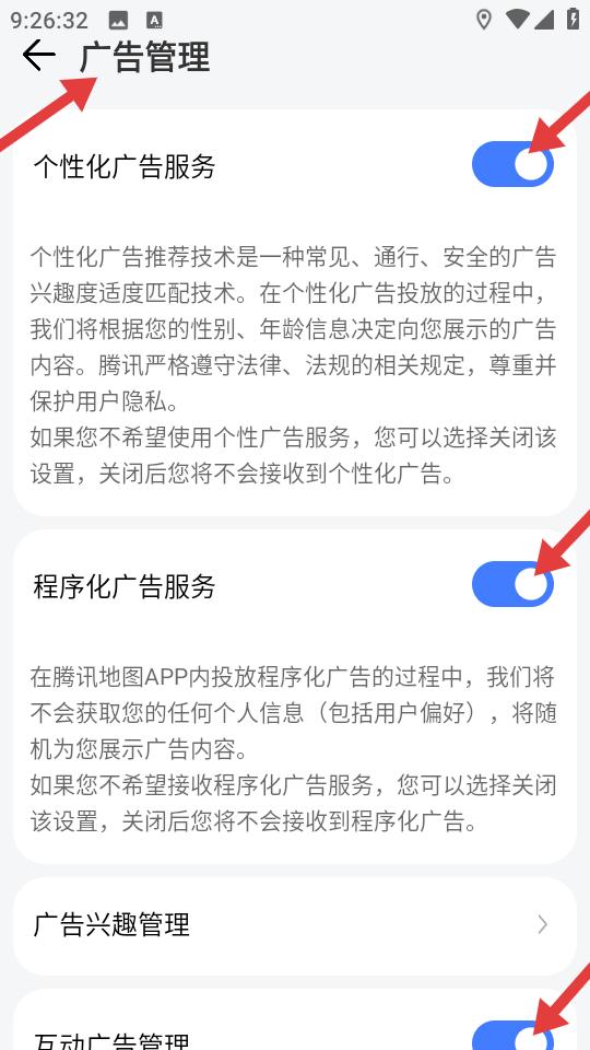3、在廣告管理頁面找到個性化廣告服務、程序化廣告服務等開關,點擊關閉對應藍色按鈕,即可減少對應廣告展示達成去廣告效果。