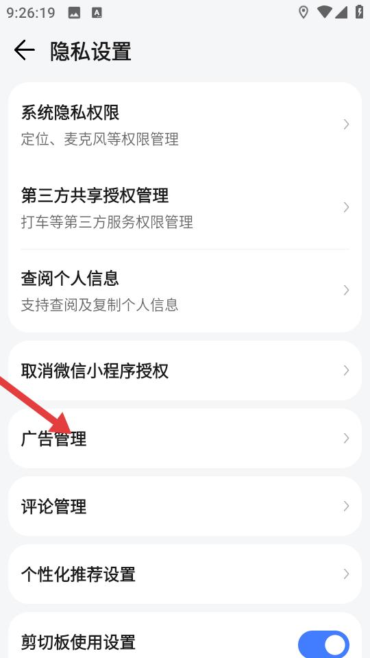 2、在隱私設置界面下滑找到廣告管理入口并點擊,進入后可查看各類廣告相關設置,靠近去廣告關鍵操作步驟鋪墊后續關閉動作。