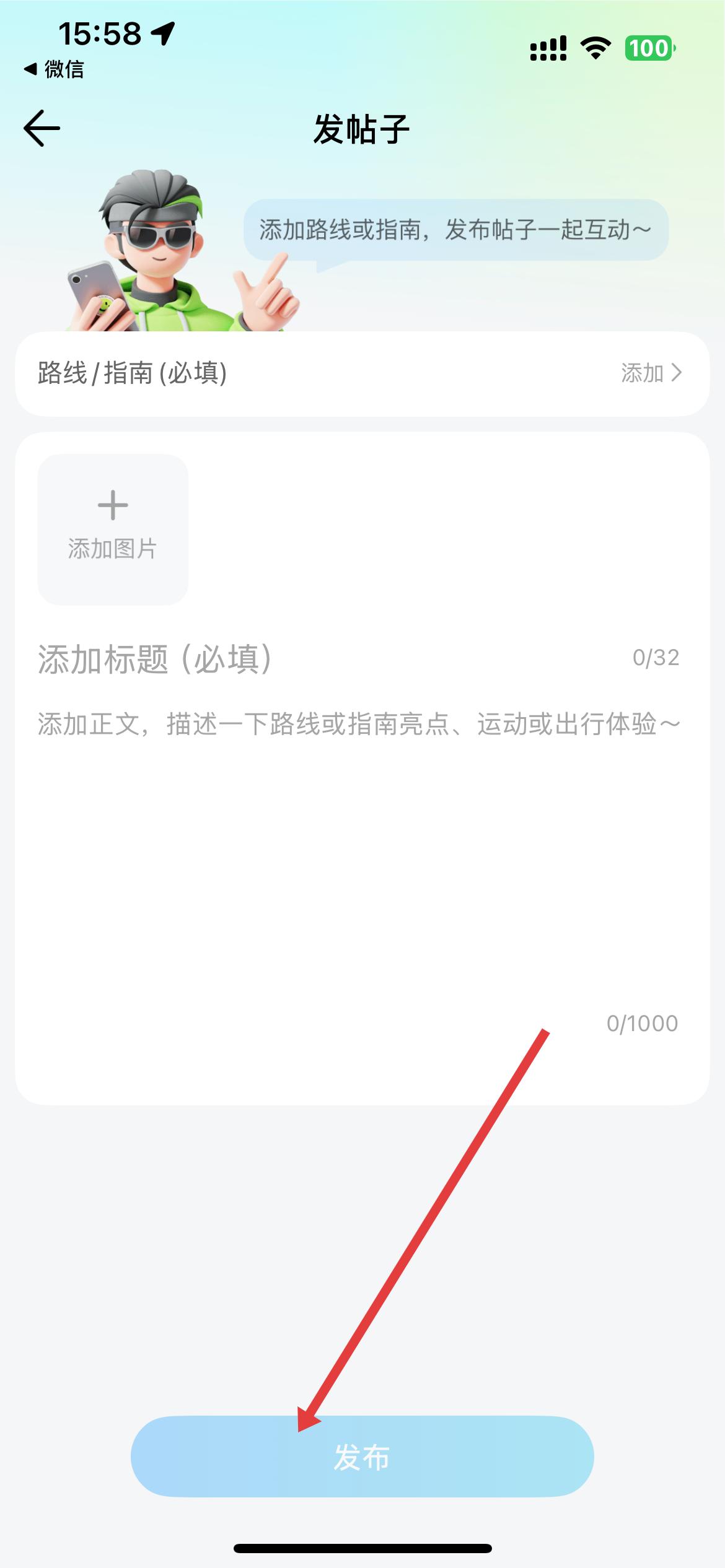3、發帖子頁面,填寫路線指南、標題、正文等必填內容,還可添加圖片,填寫完成后點擊發布,即可發布帖子。