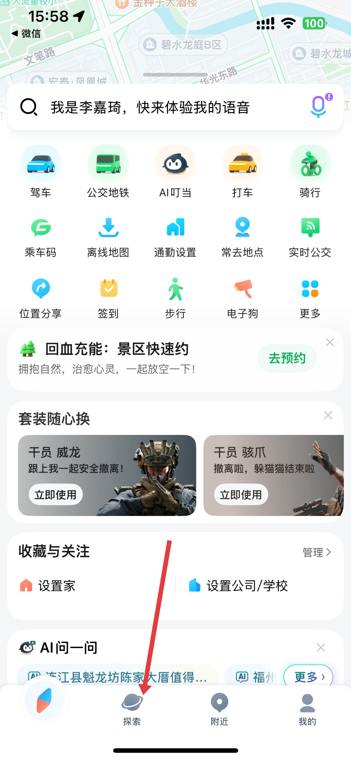 1、打開騰訊地圖主界面,有駕車、公交地鐵等各類功能按鈕,點擊底部探索,進入城市探索頁面。