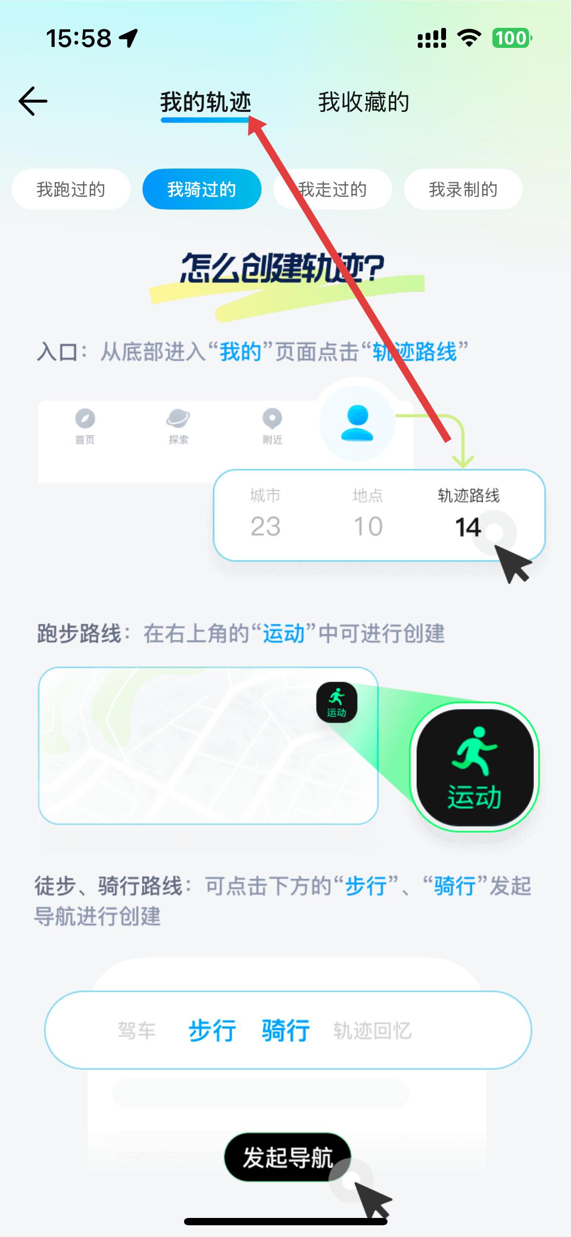 4、發布帖子后,可進入我的軌跡頁面,查看自己跑過、騎過、走過的軌跡,也能了解軌跡創建的相關方法。