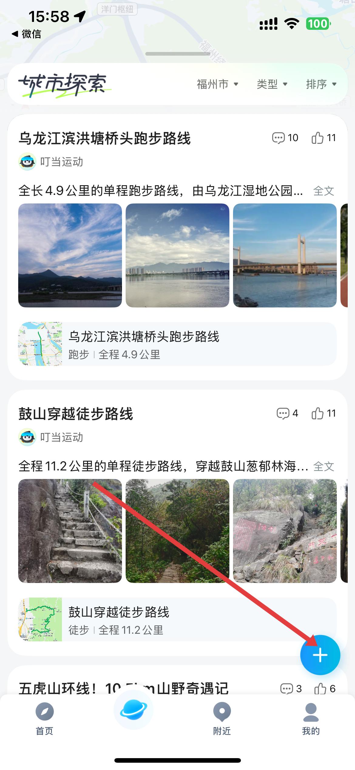2、城市探索頁面,能看到各類路線推薦,比如跑步路線、徒步路線等,點擊右下角加號,進入發帖子頁面。