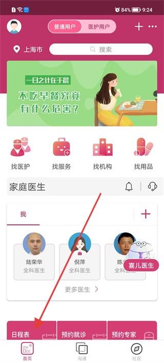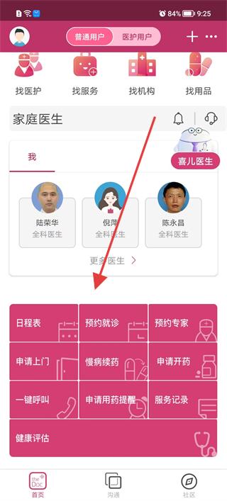 1、打開軟件進入首頁,查看找醫護找服務等功能入口,瀏覽家庭醫生列表,可選擇對應醫生,也能點擊更多醫生查看更多選項。