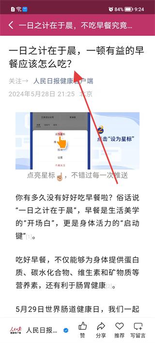 3、點擊首頁的健康資訊內容,進入詳情頁查看文章內容,了解早餐相關的健康知識。