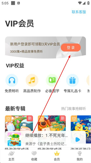 1、打開APP進入會員頁面,點擊登錄按鈕,可領取3天VIP會員,享受3000集精品故事免費聽的權益。