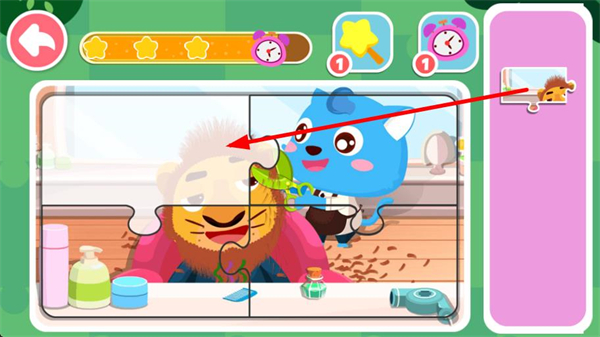 2、拖動右側的拼圖碎片,將其放置到對應空缺位置,逐步拼接出完整的萌寵畫面,完成拼圖環節。