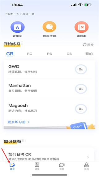 1、進入練習界面,可使用背單詞題庫搜題錯題本功能,選擇GWD等練習冊,開啟CR模塊的學習練習,推進備考進度。