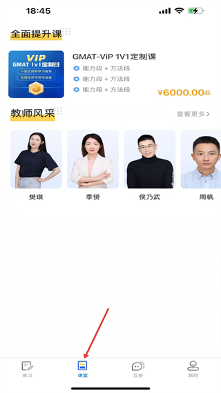 2、進入課堂界面,可查看GMAT-VIP1V1定制課,了解教師風采板塊里的講師信息,選擇對應課程提升備考能力。