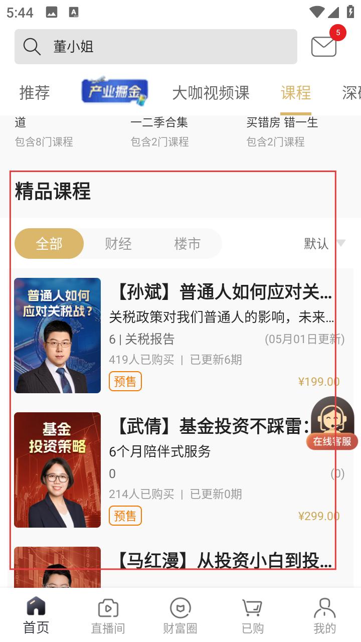 2、在課程板塊的精品課程區,可按財經、樓市分類篩選,瀏覽如孫斌、武倩等老師的課程,了解課程更新情況、已購人數及價格,方便挑選適合的投資學習課程。