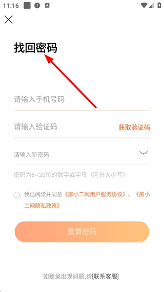 4、若忘記密碼,可進入找回密碼頁面,輸入手機號碼、獲取并輸入驗證碼,設置新密碼后點擊重置密碼,即可重新登錄房小二APP。