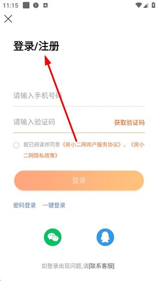 3、登錄注冊時,可輸入手機號碼、獲取并輸入驗證碼,勾選協議后登錄,也可選擇密碼登錄、一鍵登錄或微信、QQ等第三方登錄。