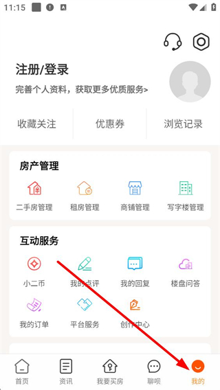 2、點擊我的按鈕,進入個人頁面,可進行注冊登錄,管理收藏關注、優惠券和瀏覽記錄,進行二手房、租房等房產管理,參與互動服務。