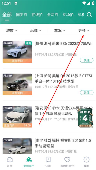 3、進入競拍大廳頁面,點擊更多,可展開更多篩選條件,方便篩選車輛。