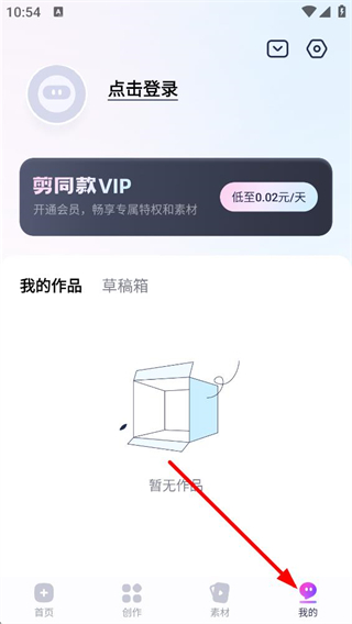 2、點擊我的選項,進入個人界面,可點擊登錄,查看剪同款VIP會員信息,還有我的作品和草稿箱板塊,暫未發布作品時顯示暫無作品。