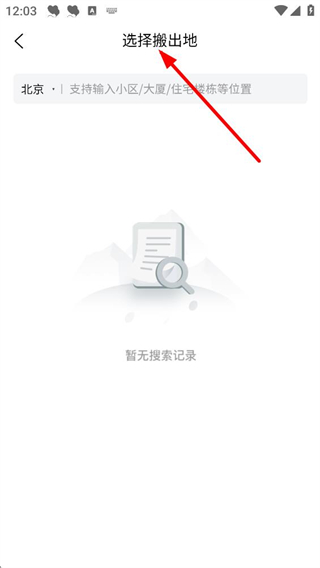 2、選擇搬出地界面,可輸入小區、大廈、住宅樓棟等位置信息,確定搬出地址,為搬家預約提供基礎信息。