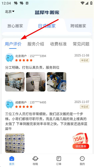 4、查看用戶評價板塊,可了解其他用戶的搬家體驗和評價,查看服務介紹、收費標準和常見問題,幫助選擇合適的搬家服務。