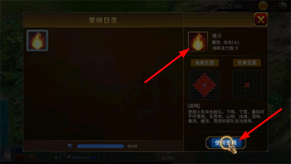 3、在策略目錄可查看煉火等策略的屬性和使用說明,點擊使用策略可對敵人發起策略攻擊,增強戰斗手段。