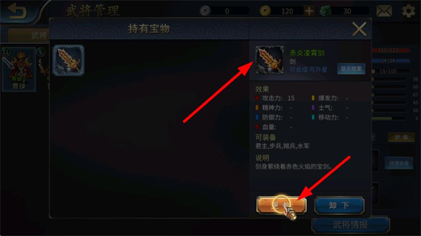1、在武將管理界面可查看持有寶物如赤靈凌霄劍的屬性,點擊裝備可讓武將穿戴寶物,提升武將戰力。