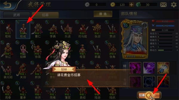 2、在武將招募界面花費金幣招募荀彧等武將,擴充武將陣容,為戰斗策略制定提供更多選擇。