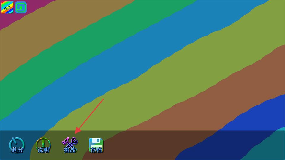 1、畫面背景是多彩的條紋,下方設置有退出、說明、挑戰、存檔四個按鈕,界面簡潔,功能明確,點擊挑戰進入。