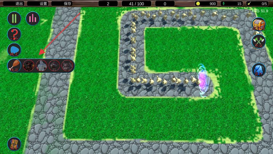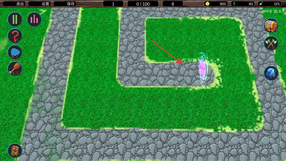 2、游戲界面中石路與草地構成的場景里,有個紫色的物件,會出現怪物,左側分布著諸如暫停、問號等功能按鈕。