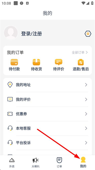 2、點擊我的按鈕,進入個人頁面,可進行登錄注冊,管理我的訂單、地址、評價、優惠券等,還能聯系本地客服和進行平臺投訴。