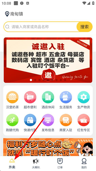 1、進入叮個飯APP外賣頁面,可搜索商家或商品,使用漢堡奶茶、超市便利等多種功能入口,還能看到誠邀入駐和福利活動的宣傳。