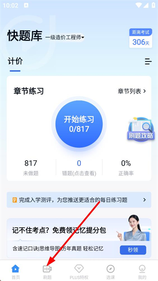 1、進入一級造價工程師快題庫界面,點擊底部刷題按鈕,界面展示章節練習板塊,還有開始練習按鈕,可開啟刷題練習,推進備考流程。