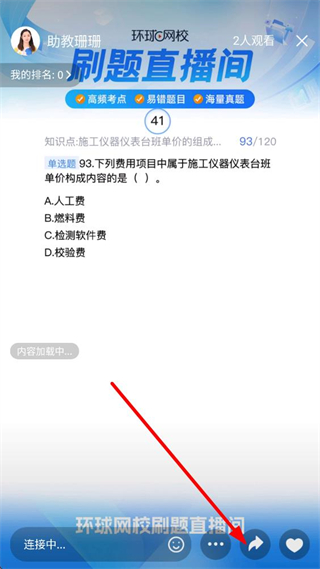 2、進入刷題直播間界面,看到一級造價工程師的單選題,底部設有發送按鈕,可參與答題互動,同步跟進直播間的刷題節奏。