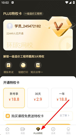 4、點擊底部PLUS特權按鈕,進入一級造價工程師特權卡界面,展示不同時長的開通選項,可選擇對應套餐解鎖題庫特權,助力備考。
