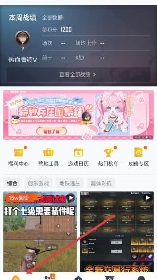 1、和平營地首頁,可查看本周戰績、游戲資訊,使用福利中心等功能,獲取游戲動態和輔助工具。