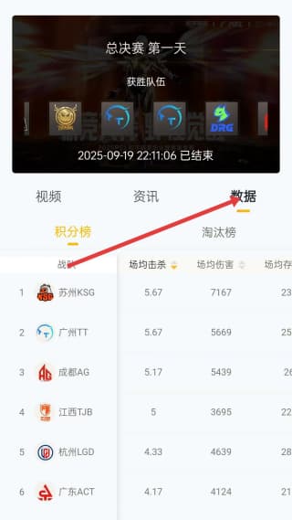 4、數據頁面,可查看積分榜、淘汰榜等賽事數據,了解各戰隊的場均擊殺、場均傷害等表現。