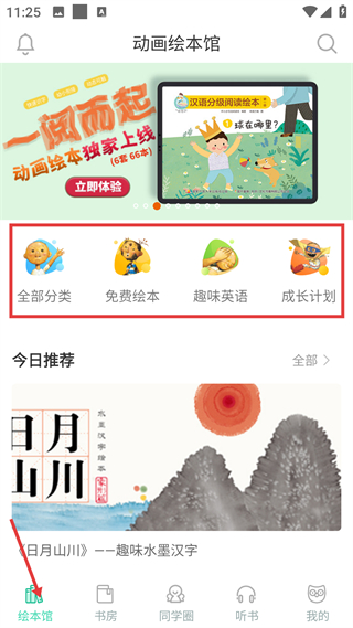 2、登錄后進入繪本館主界面,看到全部分類免費繪本等功能入口,還有今日推薦的繪本內容,可選擇對應入口。
