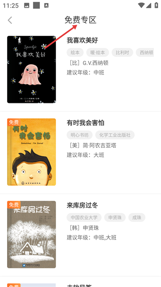 3、進入免費專區頁面,能看到不同推薦年級的免費繪本列表,每個繪本標注作者及類別,可選繪本查看詳情。