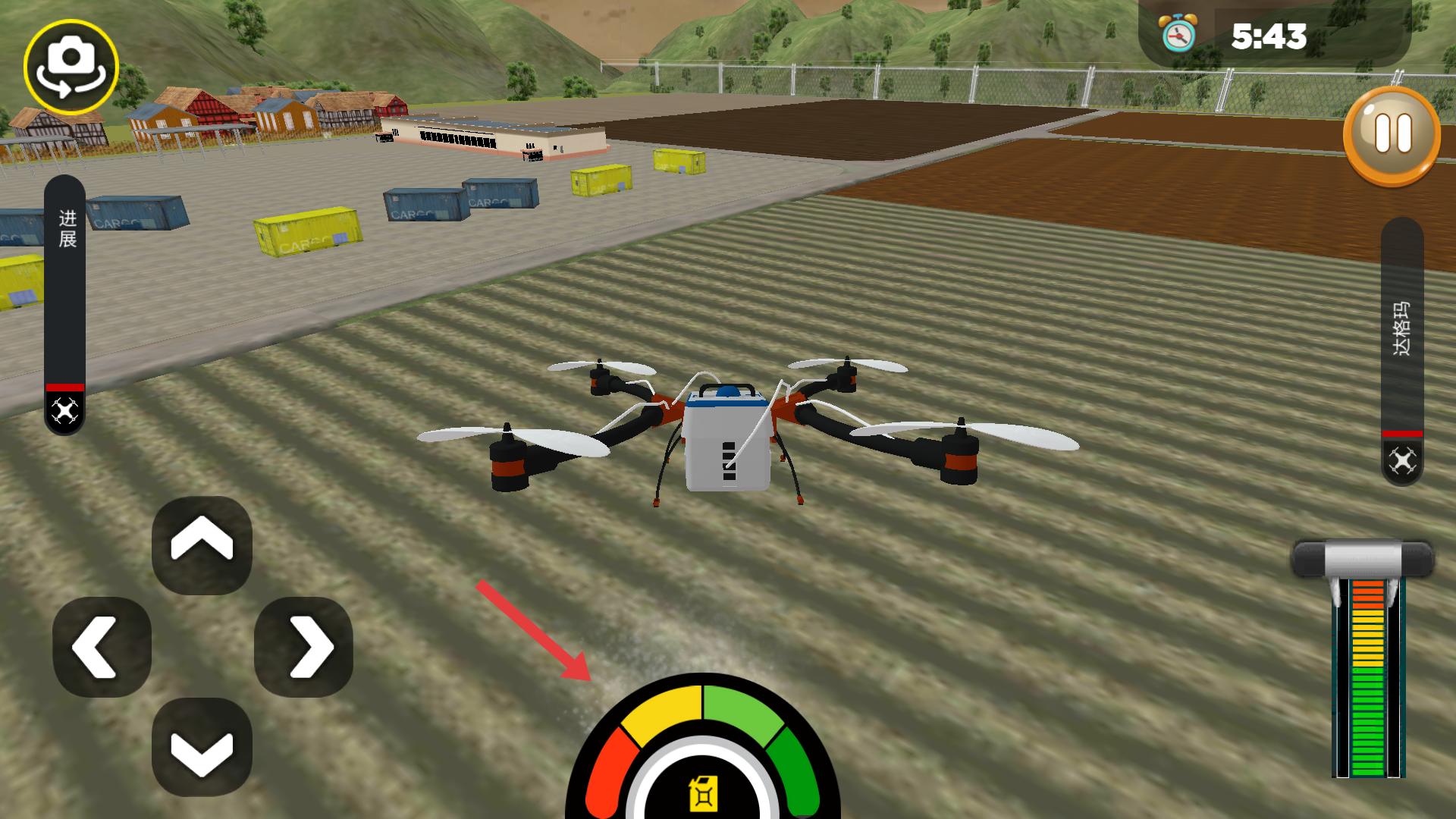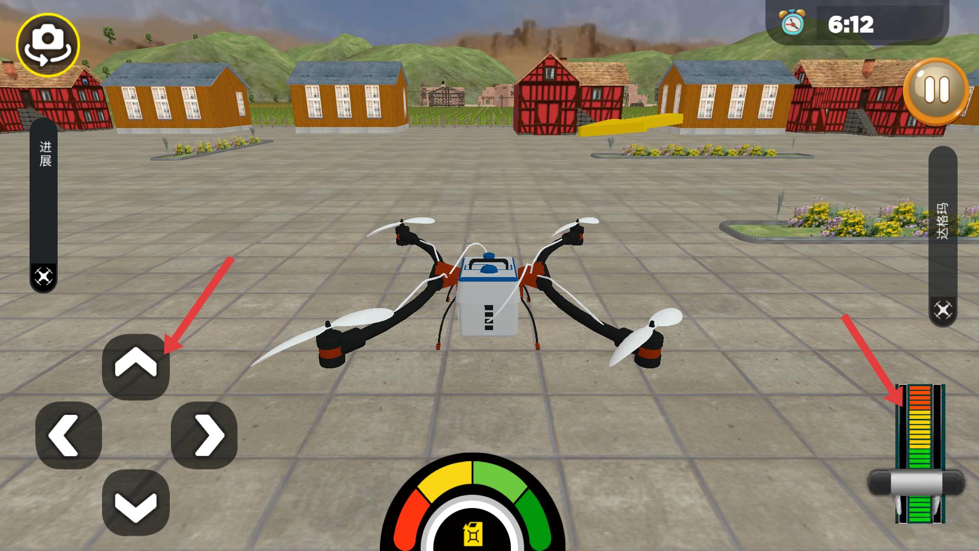 2、通過方向按鈕控制無人機起飛、轉向,留意右側能量條,保持電量充足,平穩飛行,前往農田。