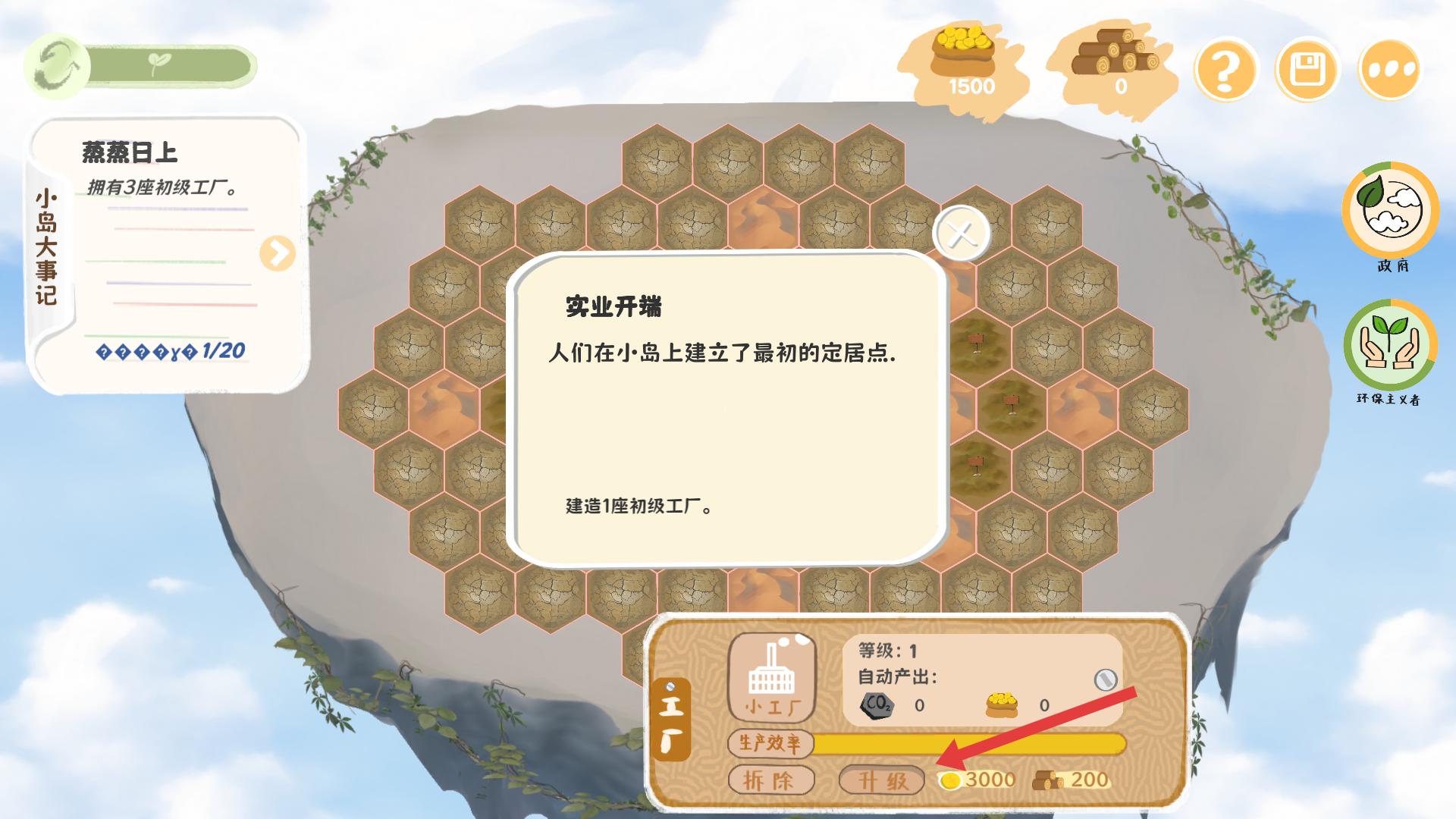4、當工廠建造完成且有足夠資源時,對工廠進行升級,提升工廠的生產效率等性能,進一步促進島嶼的繁榮發展。