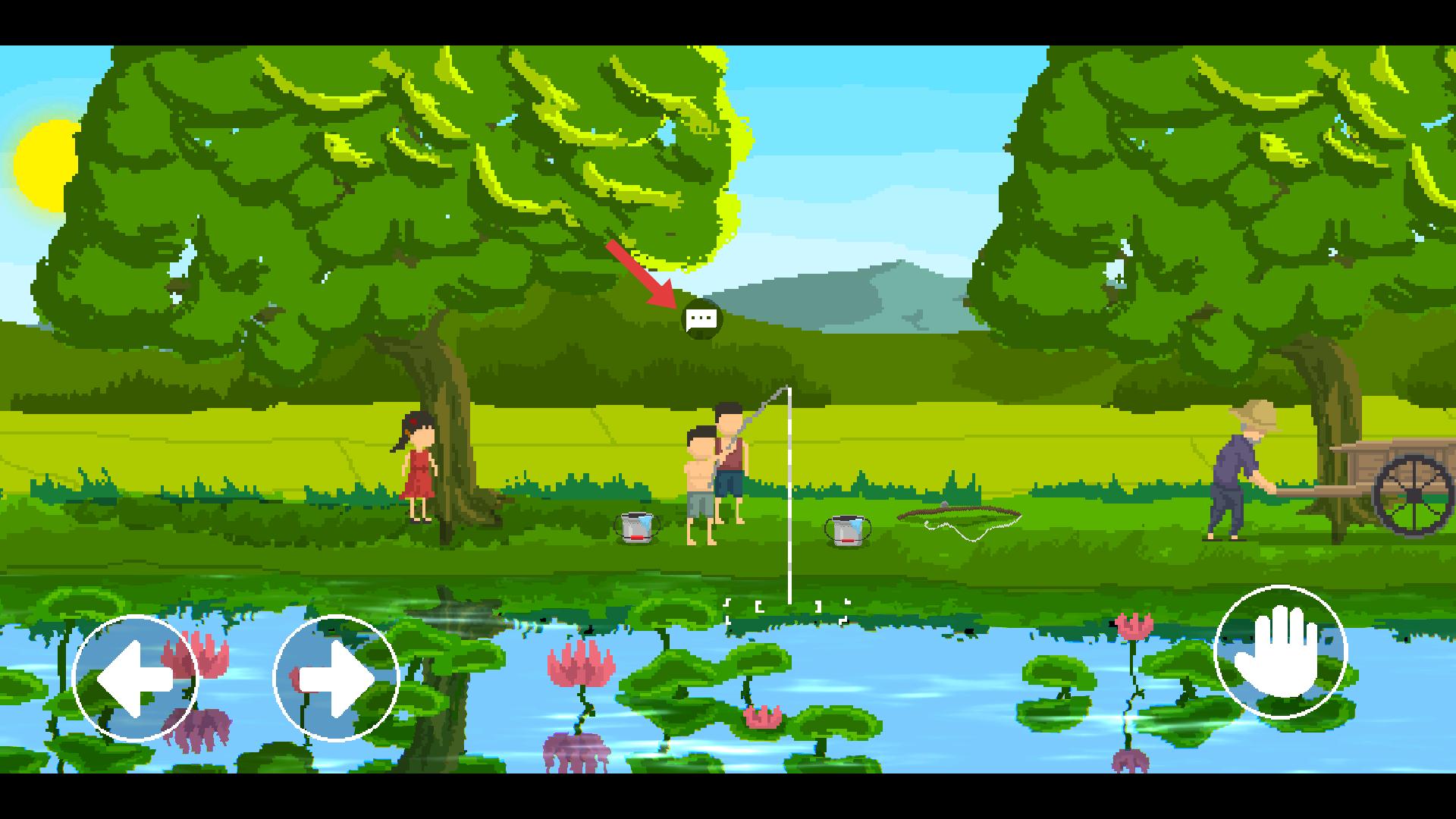 3、進入河邊場景,操控角色移動,點擊箭頭指引的對話氣泡,觸發新劇情,與釣魚角色互動,解鎖更多內容。