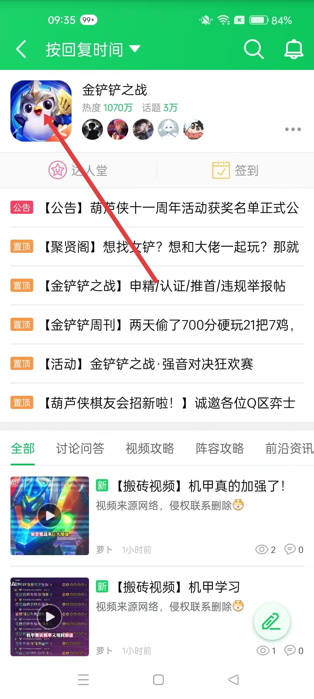 2、進入社區后,選擇金鏟鏟之戰板塊,可進入該游戲的話題頁面,查看公告、置頂帖等內容。