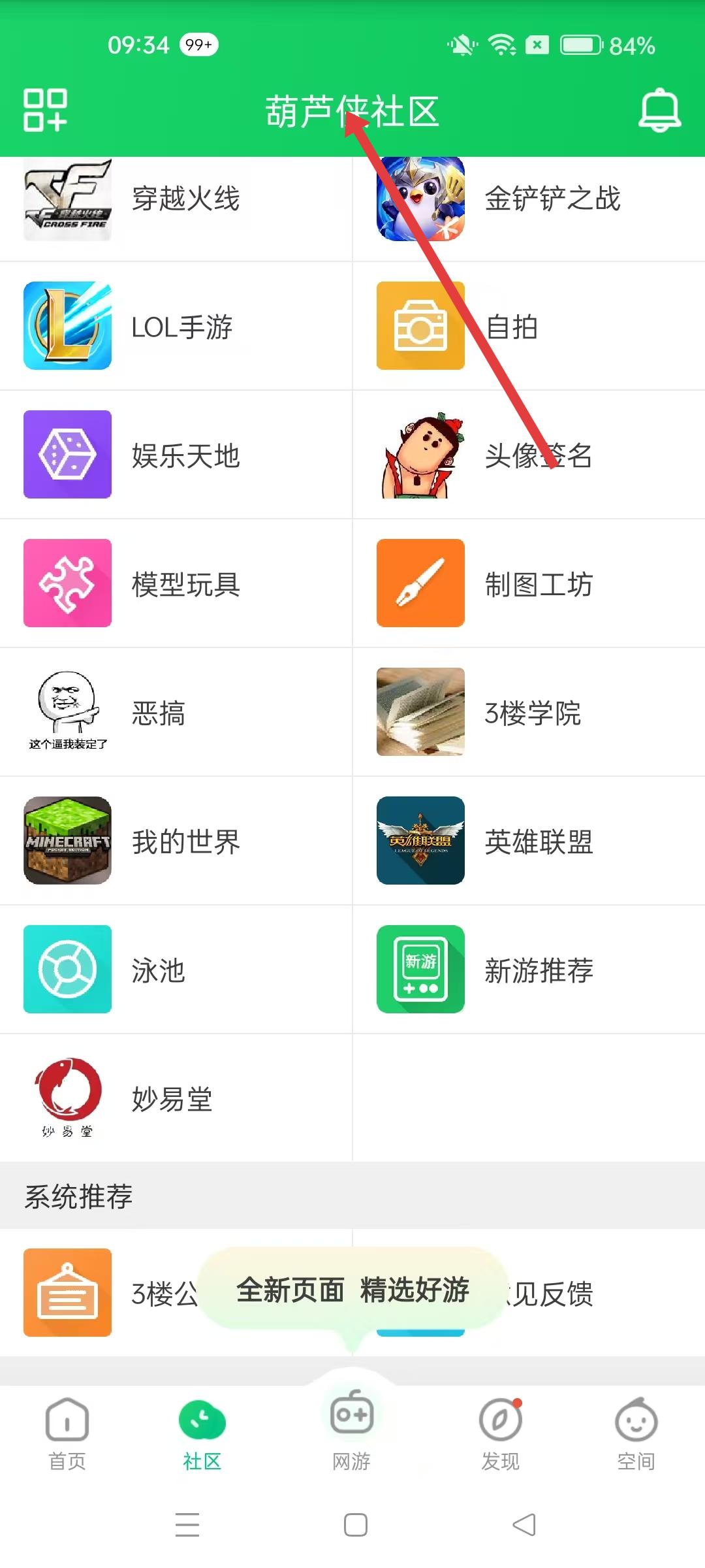 1、葫蘆俠首頁,點擊社區,可進入葫蘆俠社區頁面,查看穿越火線、金鏟鏟之戰等各類游戲板塊。