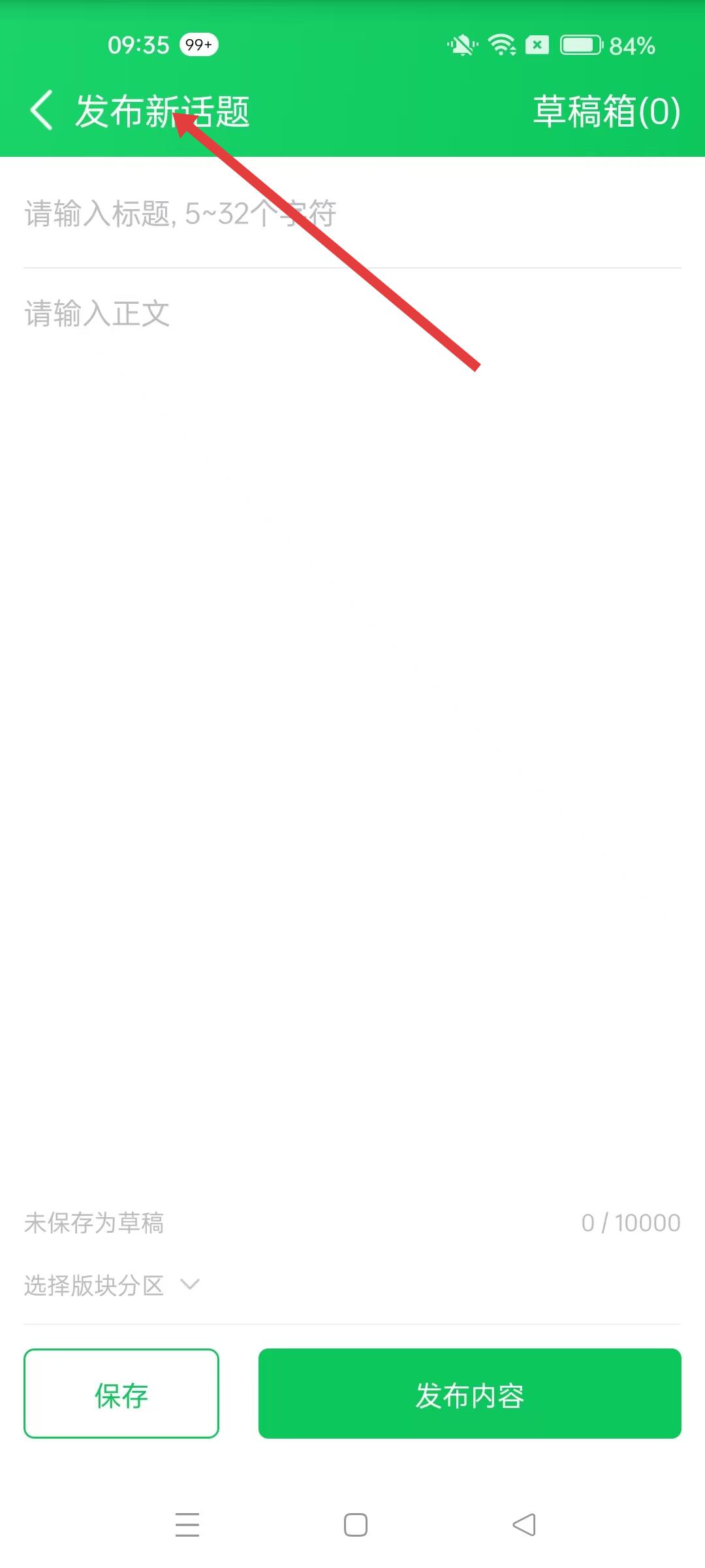 4、進入發布新話題頁面,輸入字符的標題和正文,選擇版塊分區后,可保存或發布內容。