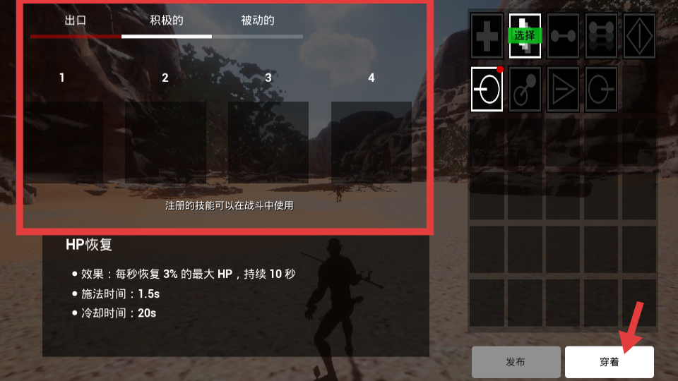 2、在技能界面可選擇積極或被動技能,注冊后能在戰斗中使用,比如選擇HP恢復技能,了解其效果、施法時間和冷卻時間,然后點擊穿著裝備技能。