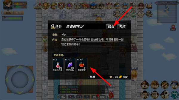 3、接受勇者的常識任務,穿戴裝備,獲取紅藥瓶、時空水晶等獎勵,提升角色的生存和戰斗能力,推進游戲劇情。
