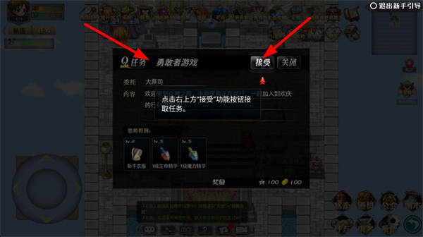 2、接受勇敢者游戲任務,獲取新手衣藏、生命精華等獎勵,推進游戲的新手引導進程,提升角色的初始戰力。